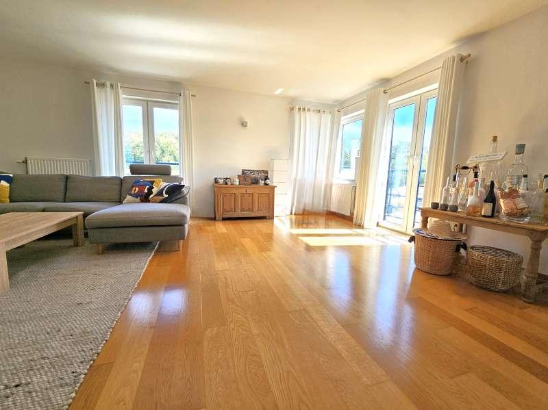 ruime, open leefruimte (80m²) met veel lichtinval, parketvloeren in de woonkamer, tegelvloer in de recente open keuken ( vaatwasser, inductievuur, ingebouwde koelkast en vriezer,..) Berging/wasplaats.