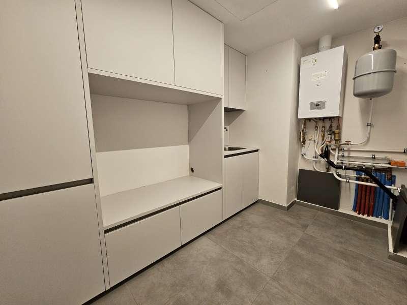 De woon-en eetkamer is voorzien van een inbouw gas-openhaard, prachtige open keuken met eiland en ontbijttoog, hoogwaardige kwaliteit met alle voorzieningen ( vaatwasser, oven en micogolfoven, inductievuur,...) aansluitend de berging/wasplaats , ook hier voorzien van inbouwkasten voor uw was- en droogmachine naast elkaar op hoogte te gebruiken en een aparte spoelbak en kraan.