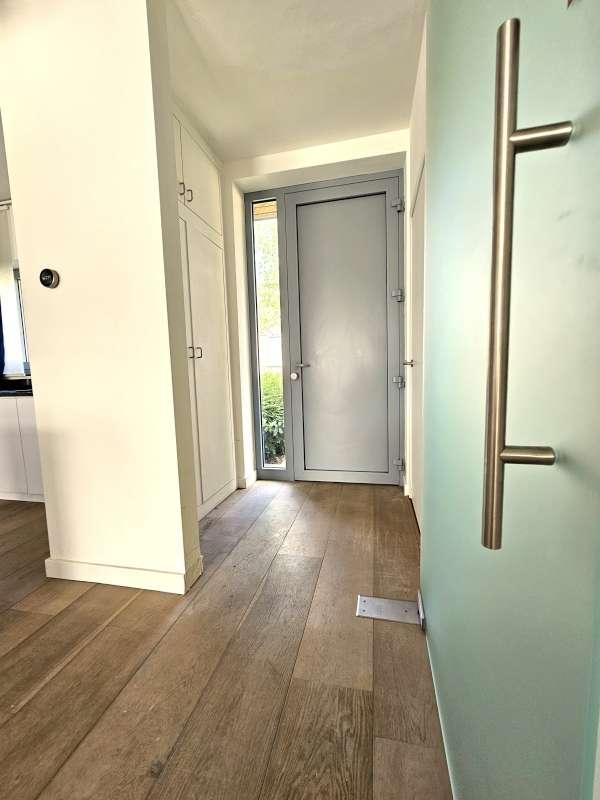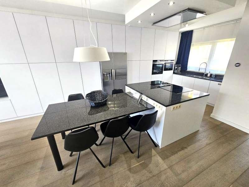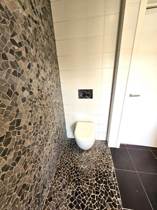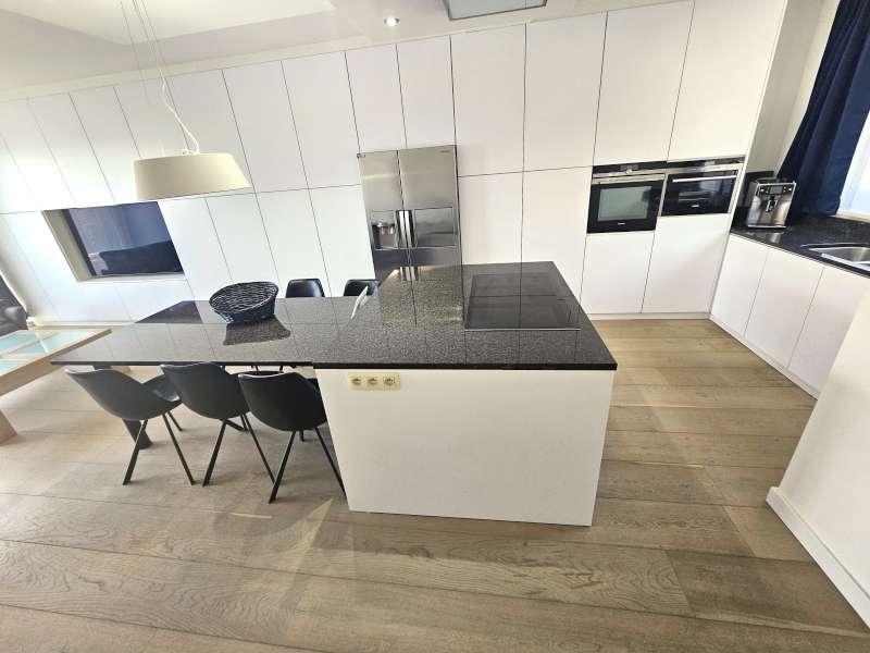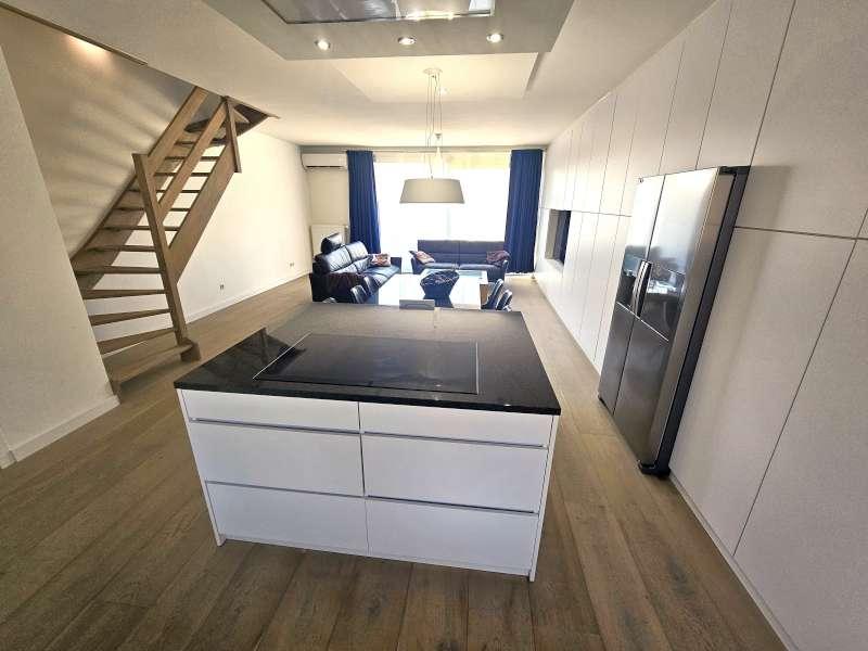gelijkvloers : inkom met apart toilet ( handenlavabo), kleine berging, glazen deur (plafondhoogte) naar de open leefruimte van 60 m² , open keuken met eiland, volledig uitgerust ( vaatwasser, dubbele oven functie,....) kastenwand over de volledige lengte van de leefruimte, airco-unit, via het schuifraam rechtstreeks toegang tot het terras en het tuintje.