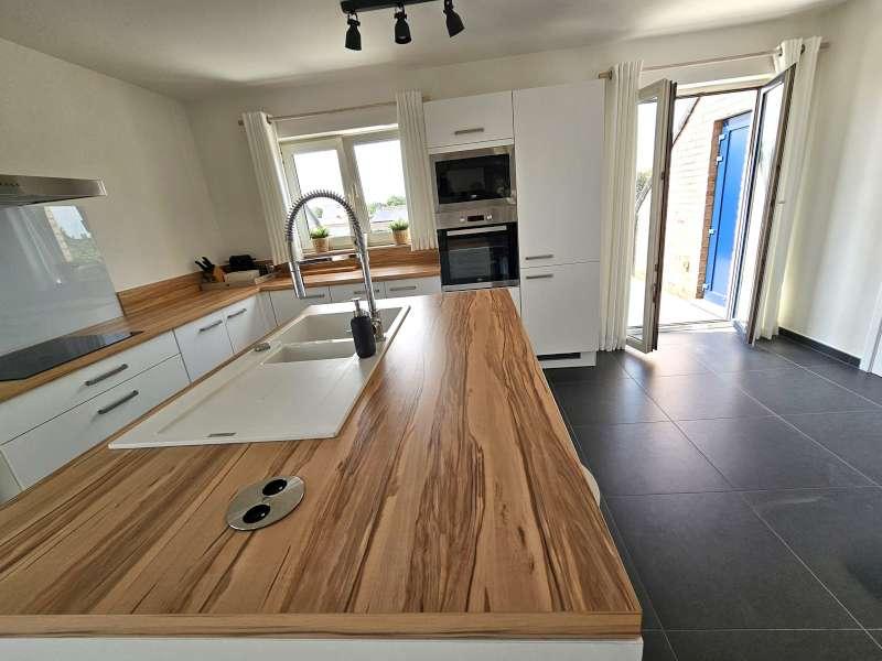 ruime, open leefruimte (80m²) met veel lichtinval, parketvloeren in de woonkamer, tegelvloer in de recente open keuken ( vaatwasser, inductievuur, ingebouwde koelkast en vriezer,..) Berging/wasplaats.
