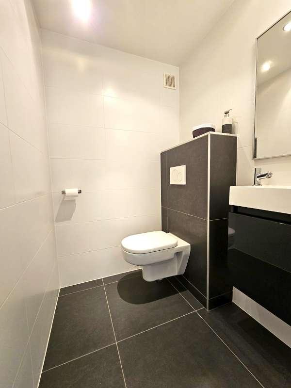 mooie badkamer, met inloopdouche, lavabomeubel met kast, hangtoilet en handdoekradiator.