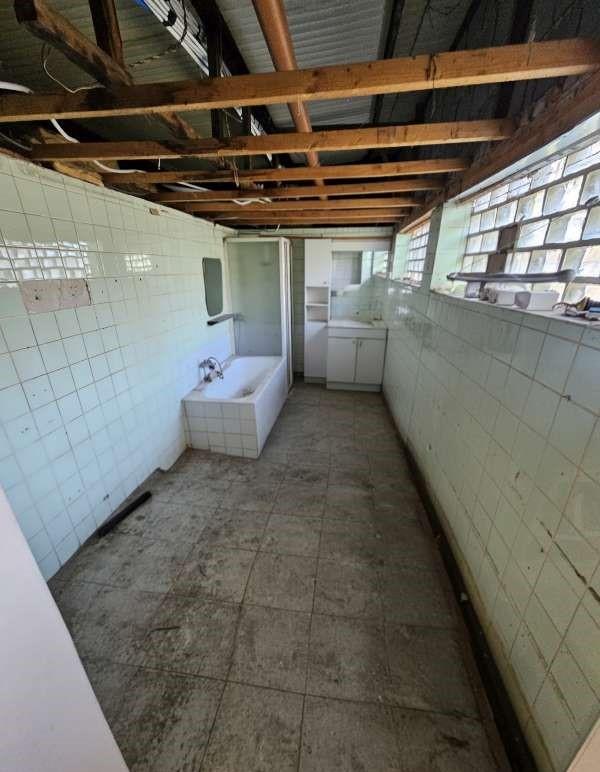 Indeling achterbouw : keuken, wasplaats, te renoveren badkamer en een apart toilet + bijkomende stockageruimte.